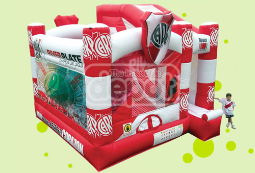 Castillo con obstáculos en forma de jugadores, espacio para saltar, escalador y tobogán con caída hacia afuera. En motivos; Boca y River.